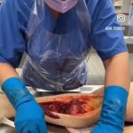 Dissection of the cadaver’s leg Video shows medical staff dissecting the lower calf of a…